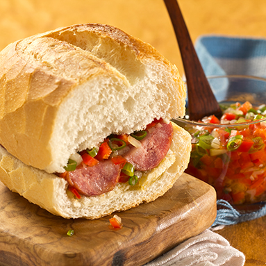 Corte o pão ao meio e na horizontal, no centro coloque a linguiça e o molho vinagrete a gosto.